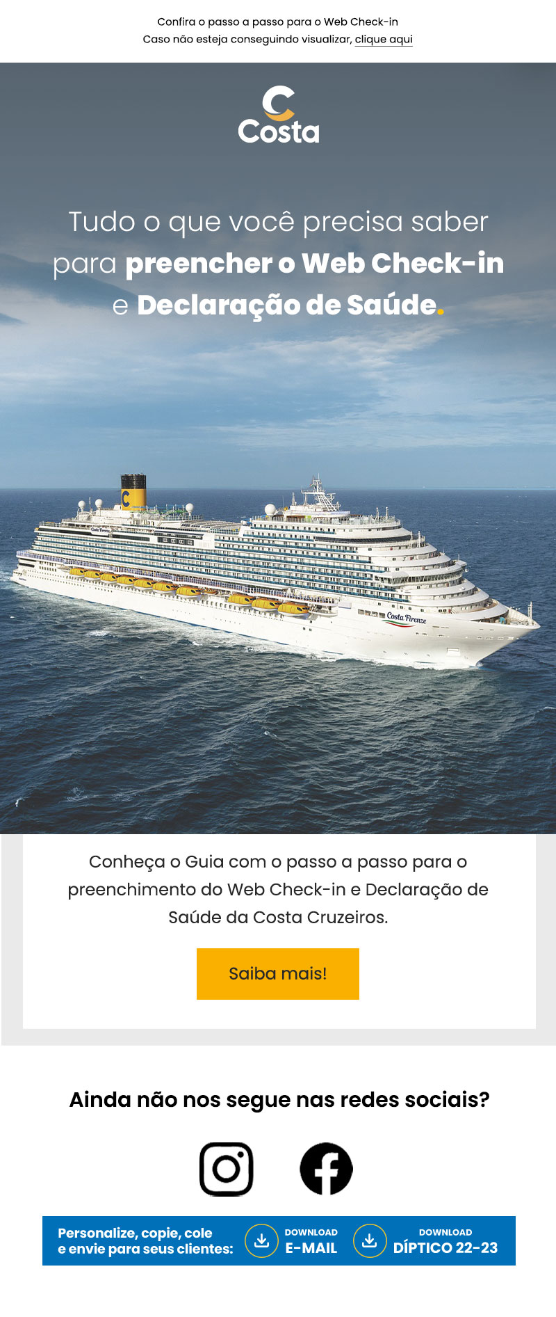 Conheça o Guia com o passo a passo para o preenchimento do Web Check-in e Declaração de Saúde da Costa Cruzeiros.